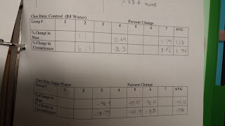 One of the eggs was placed in sugar water, while the other was placed in deionized water. The sugar water was a hypertonic solution, thus the egg shrunk in both mass and circumference. It had an average of -42.17% change in mass, and a -19.67% change in circumference, as it was going from high to low concentration - diffusion. The solute concentration was greater outside and the solvent concentration was greater inside. The cell tried to move into equilibrium, by using passive diffusion through the membrane, forcing solvent outside the cell, thus, causing the egg to shrink.